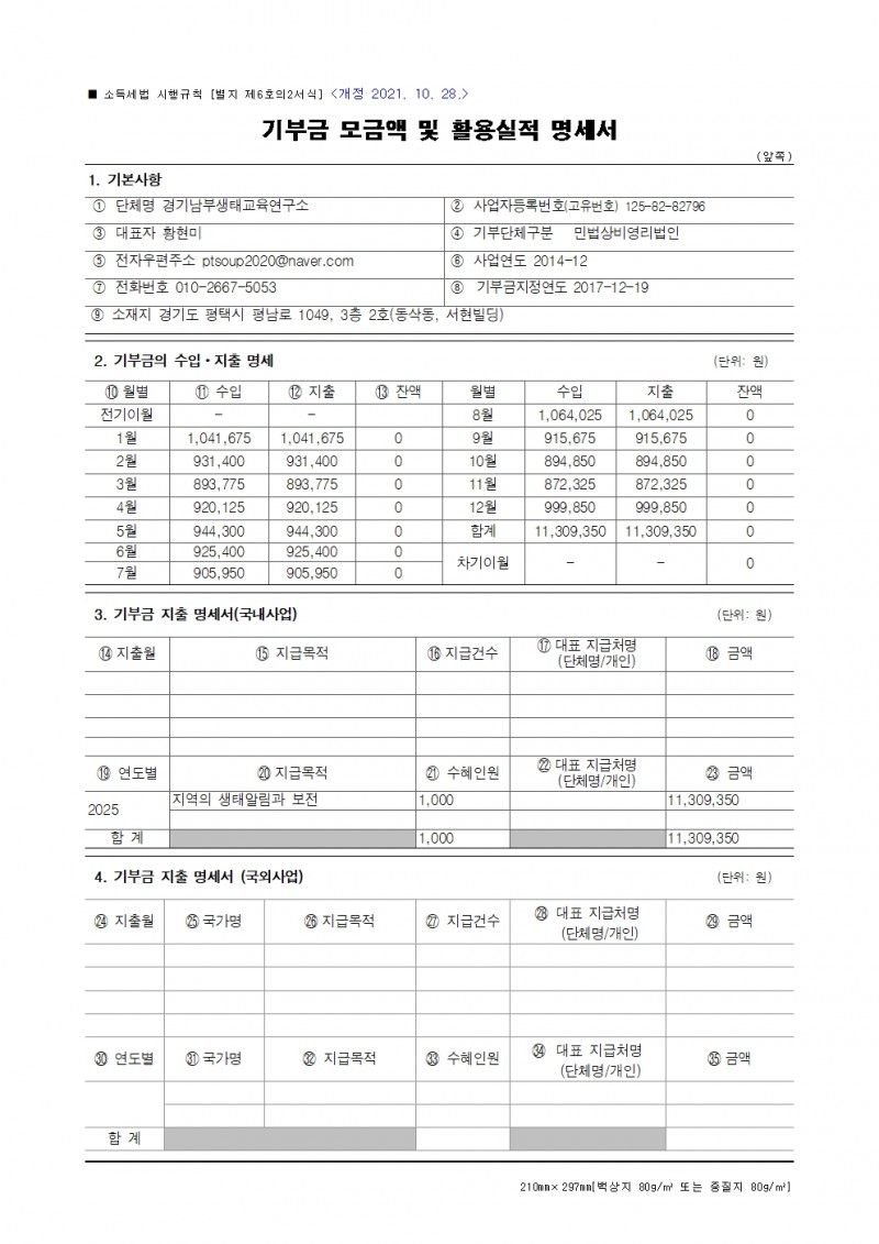2025 연간 기부금 모금액 및 활용실적 명세서 페이지 정보 작성자 경기남부생태교육연구소 작성일26-04-07 15:09 조회43회 댓글0건 관련링크 다음글 목록 본문 댓글목록 등록된 댓글이 없습니다. 다음글 목록